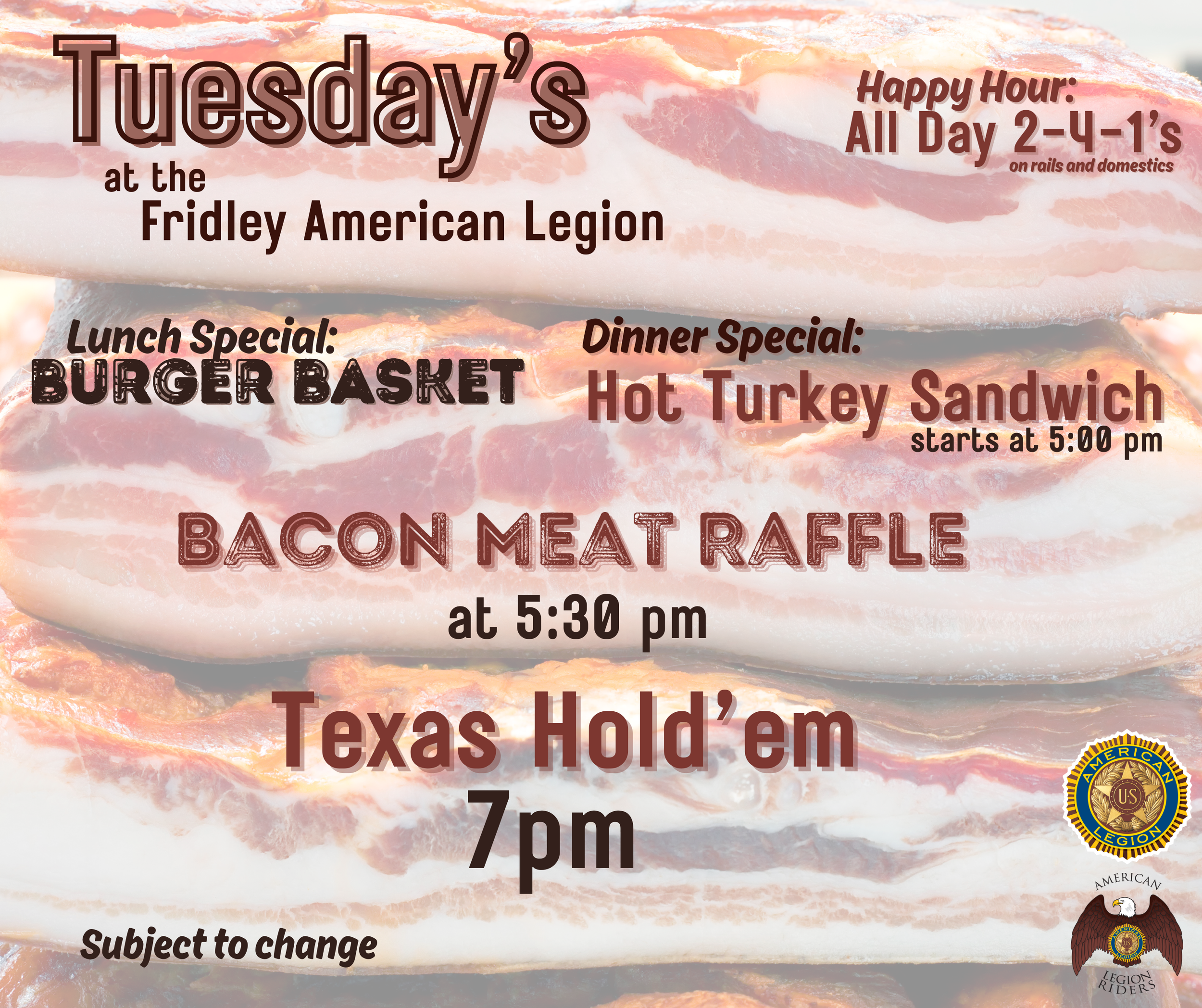 Tuesday Bacon Raffle and Bar Poker Tuesday, May 5, 2026 11:00 AM 10:00 PM 11:00 22:00 Fridley American Legion 7365 Central Avenue Northeast Fridley, MN, 55432 United States (map) Google Calendar ICS
